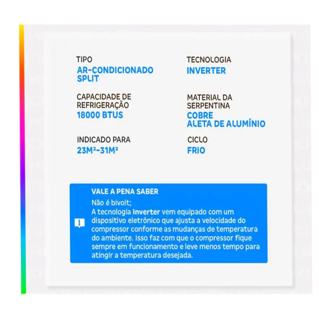 Climatize seus ambientes com potência, economia e silêncio. O Ar-condicionado Split Gree 18.000 BTUs Inverter Frio é a solução ideal para quem busca conforto térmico aliado a um consumo inteligente de energia. Com tecnologia Inverter, ele mantém a temperatura estável com menor oscilação e maior eficiência energética.